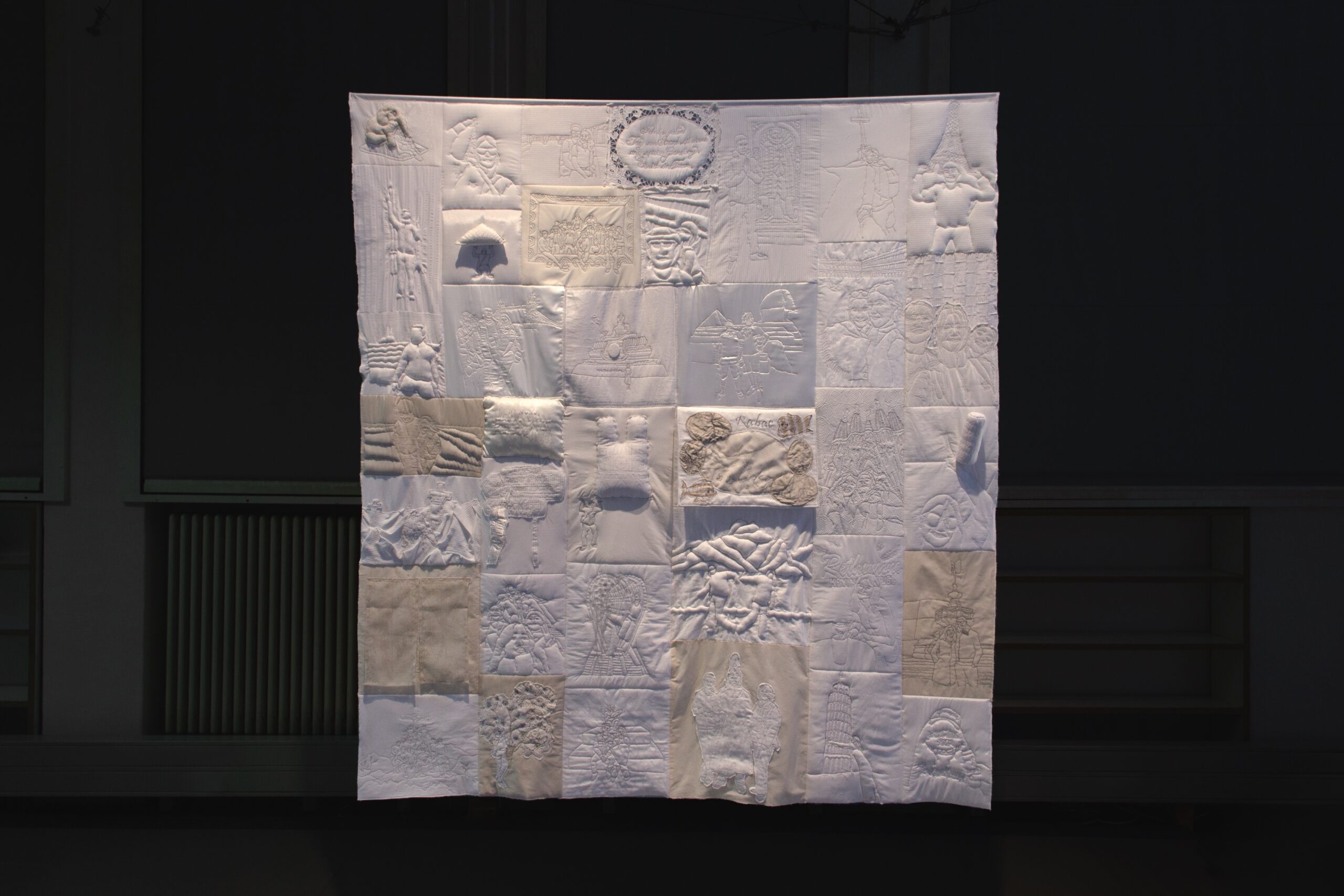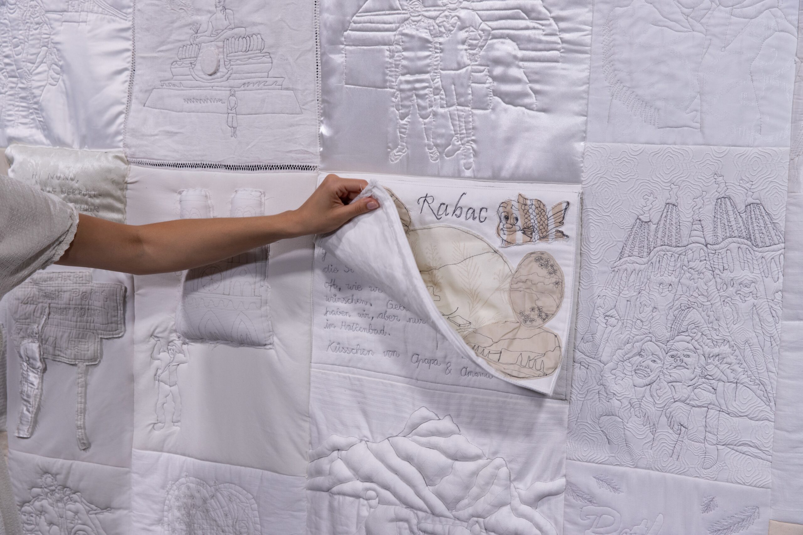 Ein Quilt, gefertigt aus alten, mit Erinnerung aufgeladenen Textilien, erzählt und verknüpft Geschichten von Erlebnissen in der Ferne und von der Leichtigkeit des Reisens. In dem textilen Objekt werden banale touristische Erlebnisse rekontextualisiert, indem sie die für Souvenirs typische Aufwertung im heimischen Kontext erfahren und hierbei die intime Gestalt einer Decke annehmen. Die Erzählstruktur der bereits verblassenden Erinnerungen entfaltet sich durch verschiedene Techniken wie beispielsweise dem Einsticken von Zeichnungen, verborgener Objekte sowie Fragmenten aus Postkarten und Fotos.